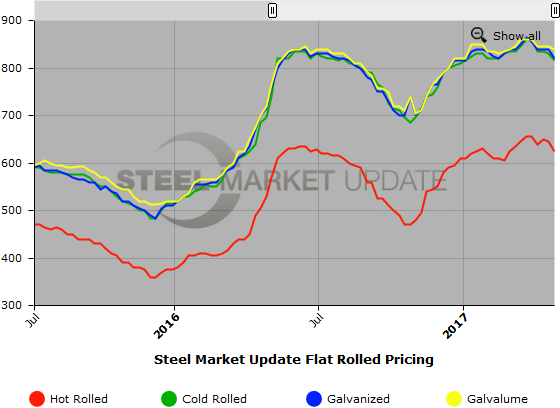 SMU Note: Below is a graphic showing our hot rolled, cold rolled, galvanized, and Galvalume price history. We will add plate prices to this graph once we have gathered a few months of data. To use the graphs interactive capabilities, you must view it on our website here. If you need help navigating the website or need to know your login information, contact us at info@SteelMarketUpdate.com or by calling 800-432-3475.