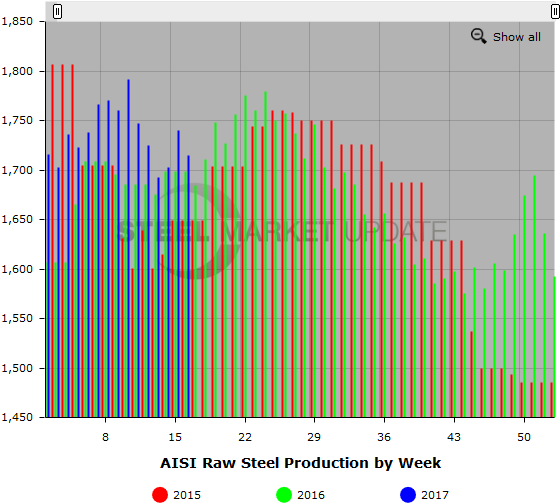 SMU Note: Below is a graphic showing the weekly raw steel production history. To use the graphs interactive capabilities, you must view it on our website. You can do this by clicking here. If you need help navigating the website or need to know your login information, contact us at info@SteelMarketUpdate.com or by calling 800-432-3475.