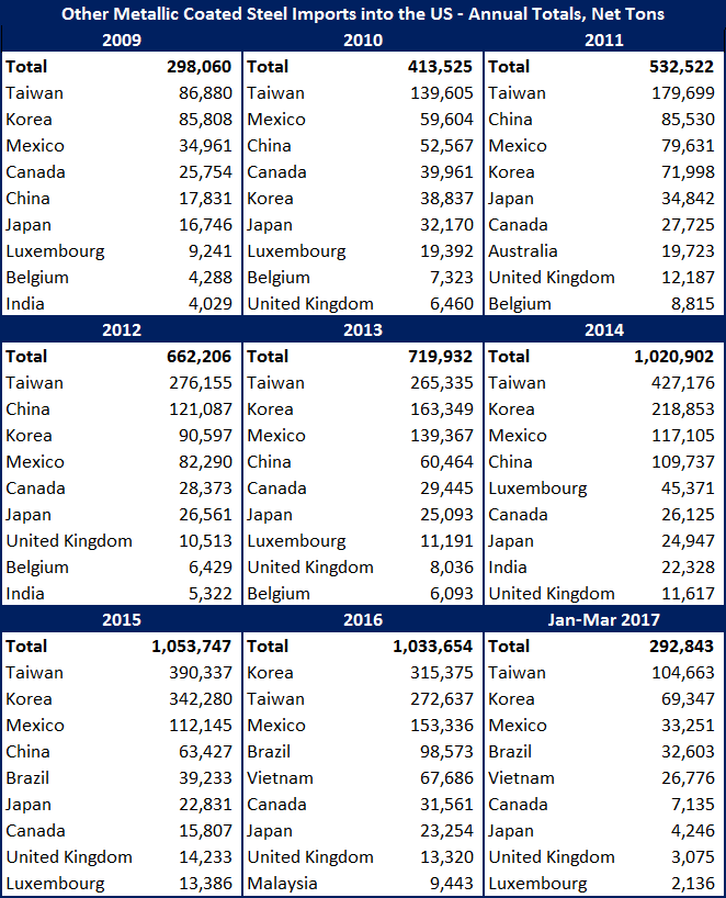 Galvalume imports through the first three months 2017 total 292,843 net tons. If this pace continues throughout the calendar year imports of “other metallic” products (with the majority being Galvalume) could exceed 1.1 million tons despite the antidumping and countervailing duty suits.