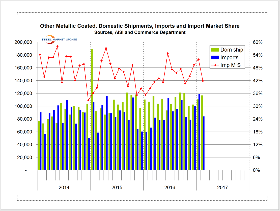 Galvalume imports through the first three months 2017 total 292,843 net tons. If this pace continues throughout the calendar year imports of “other metallic” products (with the majority being Galvalume) could exceed 1.1 million tons despite the antidumping and countervailing duty suits.