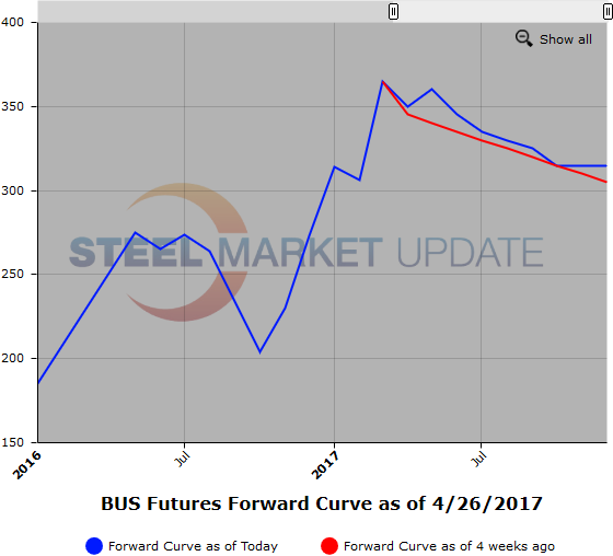 Below is another graph showing the history of the busheling scrap futures forward curve. You will need to view the graph on our website to use its interactive features, you can do so by clicking here. If you need assistance with either logging in or navigating the website, please contact our office at 800-432-3475 or info@SteelMarketUpdate.com.