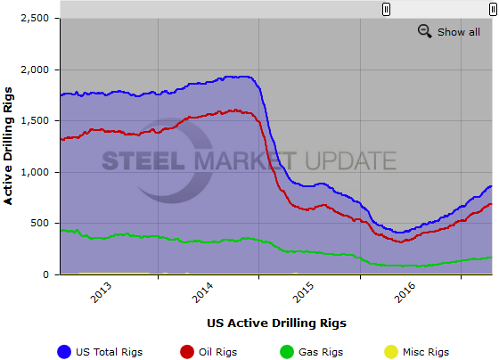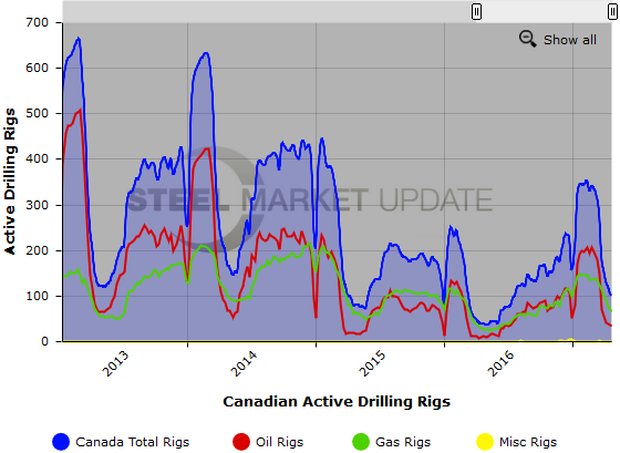 The Canadian rig count decreased by 14 to 85 rigs this past week, with oil rigs down 9 to 24 rigs, gas rigs down 5 to 61 rigs, and miscellaneous rigs unchanged at 0 rigs. Compared to last year the 85 count is up 48 rigs, with oil rigs up 14, gas rigs up 35, and miscellaneous rigs down 1. International rigs increased by 2 to 943 rigs for the month of March, a decrease of 42 rigs from the same month one year ago. For a history of both the US and Canadian rig count, visit the Steel Market Update website here.