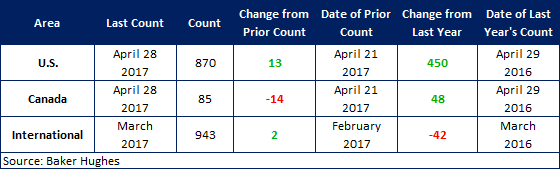 According to Baker Hughes data from April 28, 2017, the US rig count for the week was 870 rigs exploring for or developing oil or natural gas. This is up 13 rigs compared to last week, with oil rigs up 9 to 697 rigs, gas rigs up 4 to 171 rigs, and miscellaneous rigs unchanged at 2 rigs. Compared to this time last year, the 870 count is up 450 rigs, with oil rigs up 365, gas rigs up 84, and miscellaneous rigs up 1.