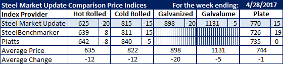 Steel prices were down across the board this past week according to the indexes followed by Steel Market Update. The biggest drops were on our own indices as we saw large moves in hot rolled, cold rolled and galvanized steel with a smaller move in Galvalume. Our plate prices were up slightly as we continue to build sources and hone in on the plate numbers (note: our price is delivered to the customer, others are FOB mill).