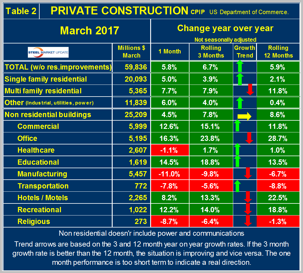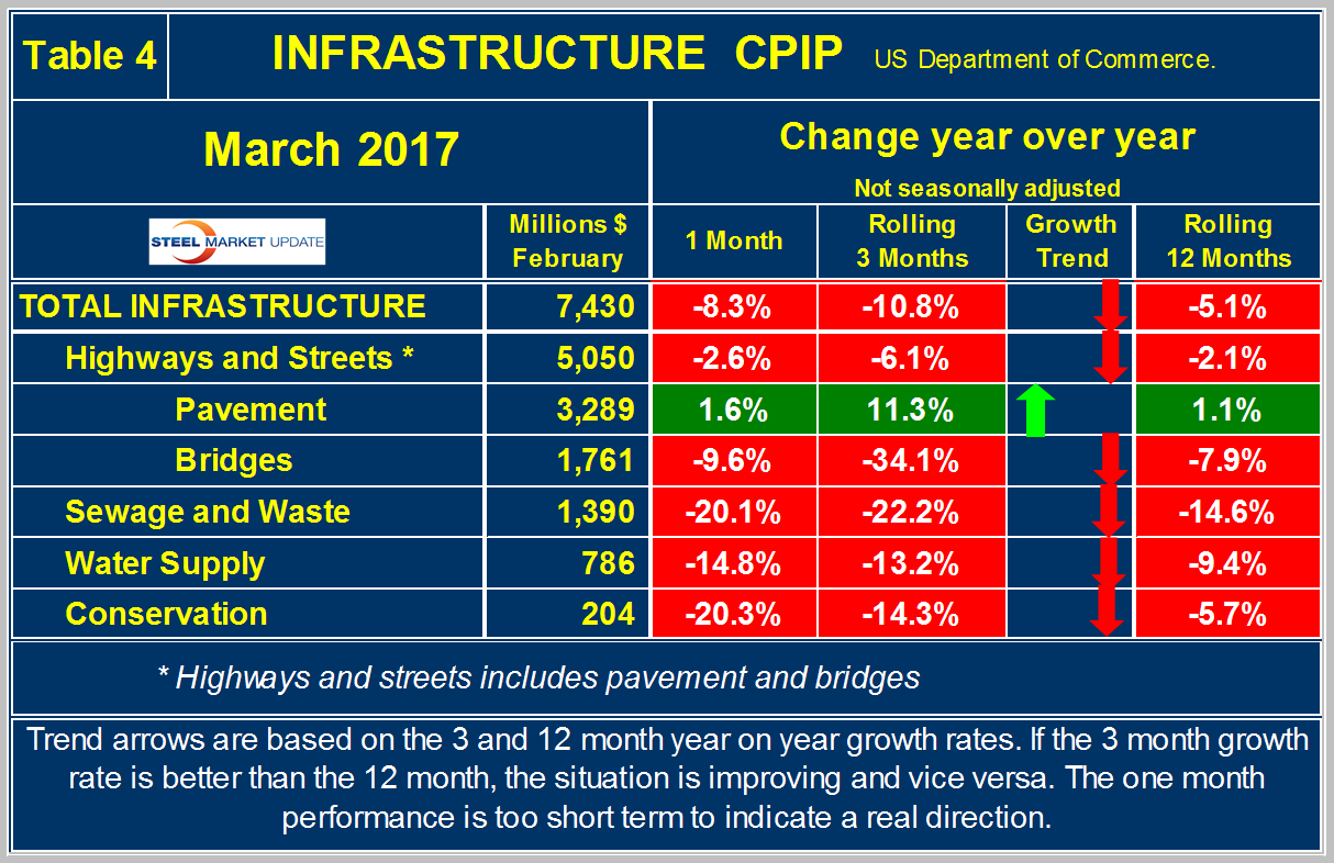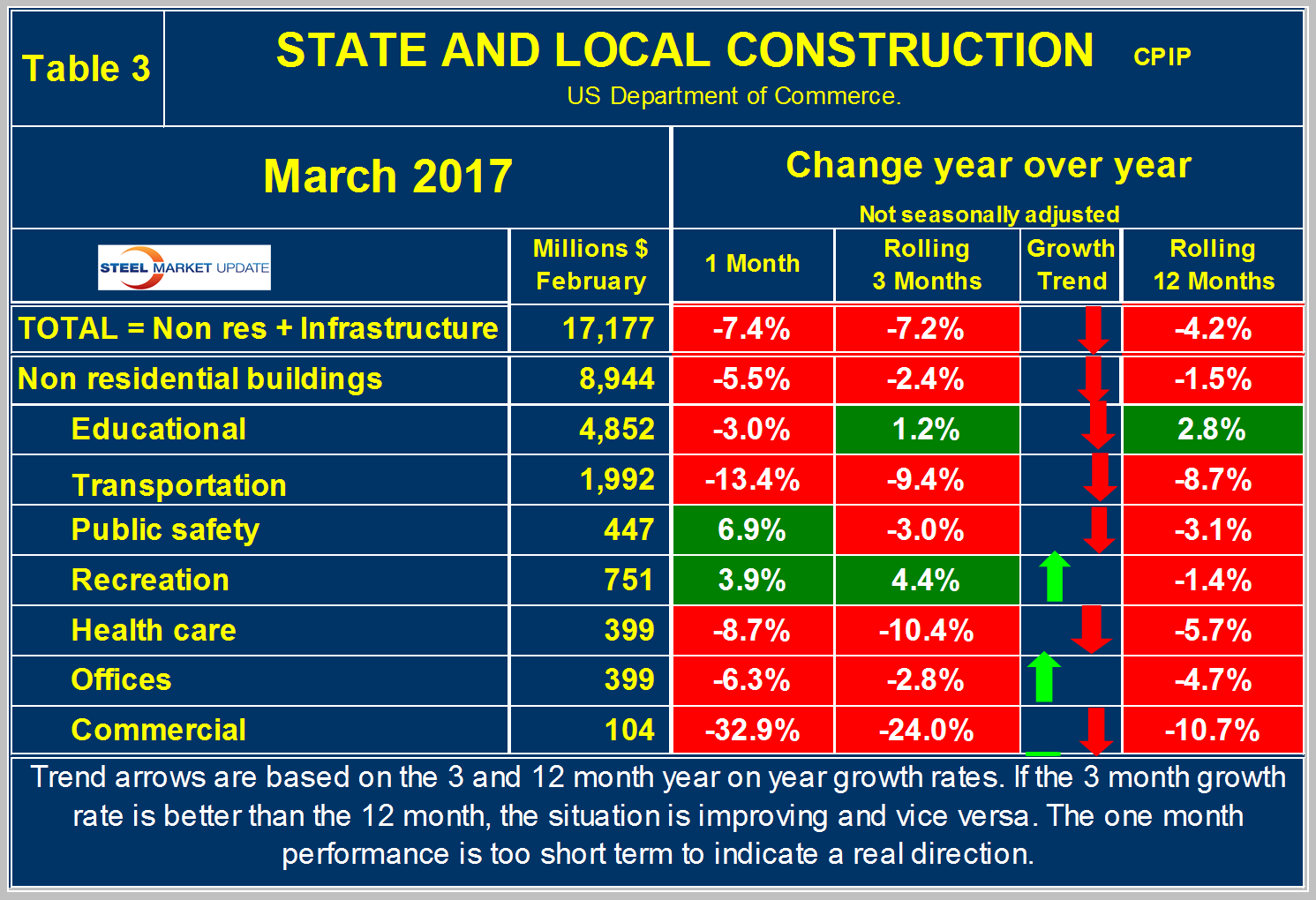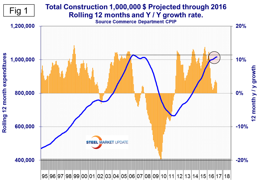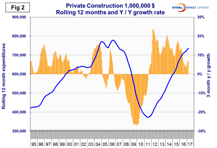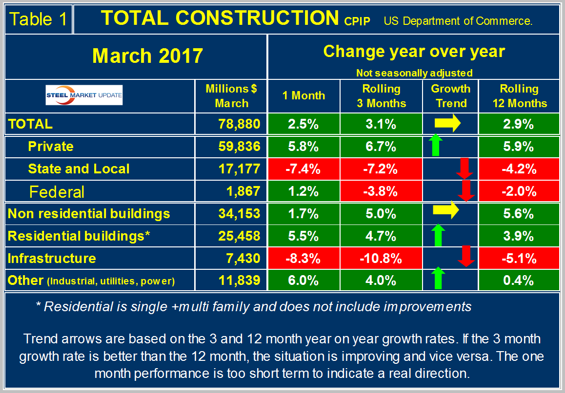 The official CPIP press release gives no appreciation of trends on a historical basis and merely compares the current month with the previous one on a seasonally adjusted basis. The data is provided as both seasonally adjusted and non-adjusted. The detail is hidden in the published tables which we at SMU track and dissect to provide a long term perspective. Our intent is to provide a rout map for those subscribers who are dependent on this industry to “Follow the money.” This is a very broad and complex subject therefore to make this monthly write up more comprehensible we are keeping the information format as consistent as possible. In our opinion the absolute value of the dollar expenditures presented are of little interest. What we are after is the magnitude of growth or contraction of the various sectors. In the SMU analysis we consider only the non-seasonally adjusted data. We eliminate seasonal effects by comparing rolling three month expenditures year over year. CPIP data also includes the category of residential improvements which we have removed from our analysis in the rational that such expenditures are minor consumers of steel.