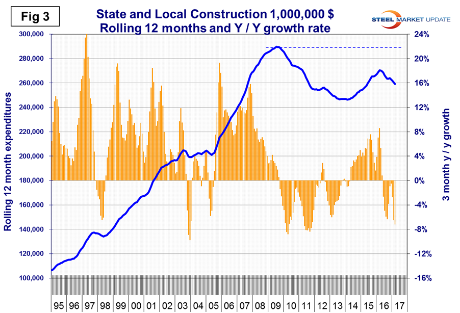 Since then, expenditures have declined and the percentage change y/y has been negative. Comparing Figures 2 and 3 we see that S&L construction did not have as severe a decline as private work during the recession and that private work bounced back faster. Private expenditures are not likely to exceed the pre-recession high in 2017 but the downturn in S&L means that a full recovery is unlikely to be achieved in this decade.