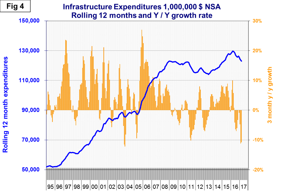 Since then, expenditures have declined and the percentage change y/y has been negative. The $305 billion congressional bill to fund roads, bridges, and rail lines that was authorized in December 2015 was the largest reauthorization of federal transportation programs approved by Congress in more than a decade, ending a prolonged period of short term stopgap bills. It would seem that some of this money would have found its way into infrastructure projects by now some 15 months after the passage of the bill. The results in Table 4 and Figure 4 indicate that this is not the case.