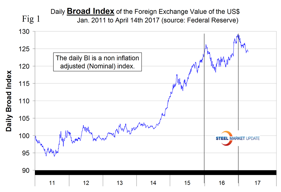 Explanation of Data Sources: The broad index is published by the Federal Reserve on both a daily and monthly basis. It is a weighted average of the foreign exchange values of the U.S. dollar against the currencies of a large group of major U.S. trading partners. The index weights, which change over time, are derived from U.S. export shares and from U.S. and foreign import shares. The data are noon buying rates in New York for cable transfers payable in the listed currencies. At SMU we use the historical exchange rates published in the Oanda Forex trading platform to track the currency value of the US $ against that of sixteen steel trading nations. Oanda operates within the guidelines of six major regulatory authorities around the world and provides access to over 70 currency pairs. Approximately $4 trillion US $ are traded every day on foreign exchange markets.