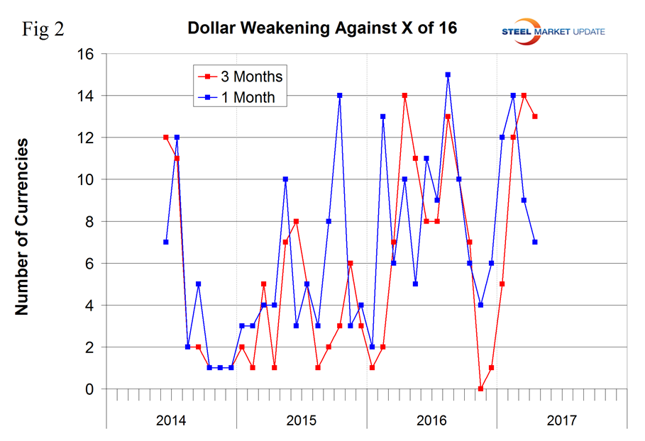This show very dramatically how the direction in the value of the dollar on a rolling 3 month comparison has done a complete reversal between November 2016 when it was strengthening against all sixteen to March 2017 when it weakened against fourteen of the sixteen. In April the $ weakened against 13 of the 16. Table 1 is color coded to indicate strengthening of the dollar in red and weakening in green. We regard strengthening of the US Dollar as negative and weakening as positive because the effect on net imports. The April 26th version of Table 1 has the dollar weakening against seven of the sixteen at the one month level and against nine of the sixteen at the seven day level.