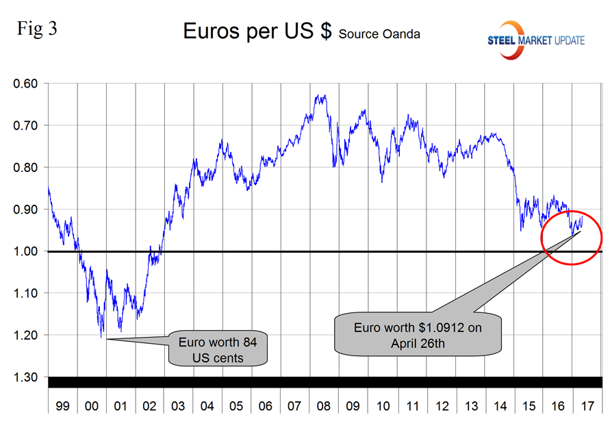 The Euro. On April 26th the Euro was worth 1.0912 US dollars. It has appreciated by 1.5 percent in the last three months with an erratic climb throughout the first four months of 2017 (Figure 3).