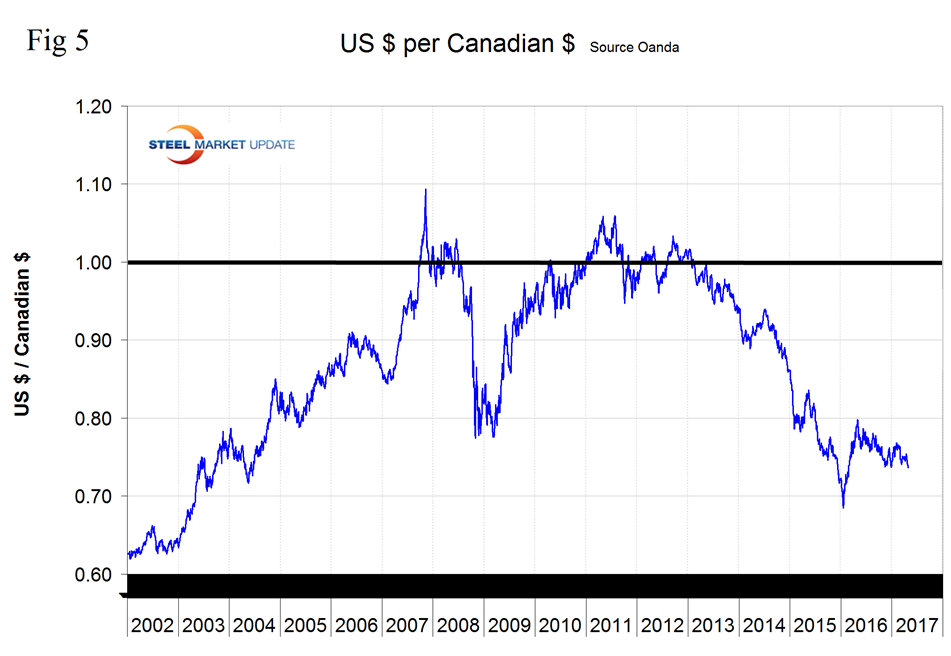 The Canadian $ has declined by 3.4 percent in three months with an acceleration in the last few days resulting from US threats of a lumber import tariff (Figure 5).