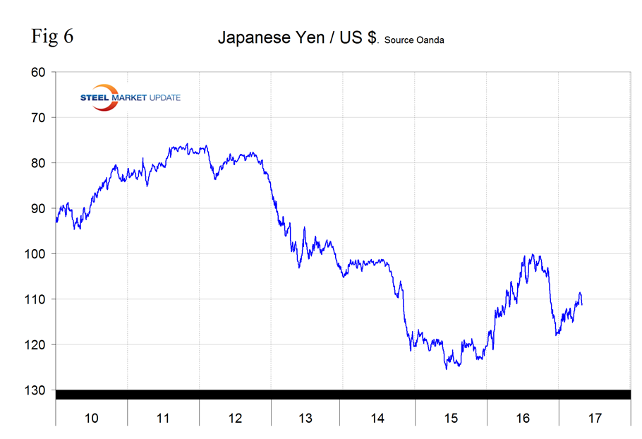 In the last three months the Yen has appreciated by 1.7 percent but gave that back and more by depreciation by 2.3 percent in the last seven days, Figure 6.