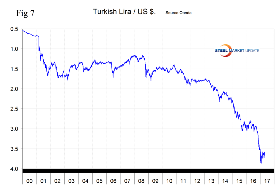 Figure 7 shows the number of Lira necessary to buy one US $ since January 2000. The Lira had an all time low of 3.869 on January 27th and has since strengthened to 3.580/$.