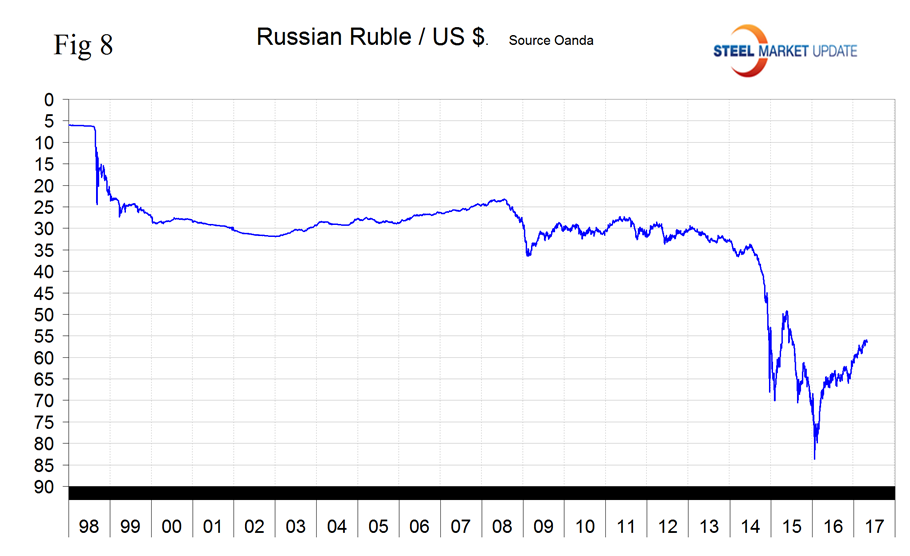 The Ruble had an all time low of 83.665 on January 21st 2016 and has since strengthened to 56.485/US $. The Ruble is up by 17.0 percent in 12 months and by 4.9 percent in the last three months, Figure 8.