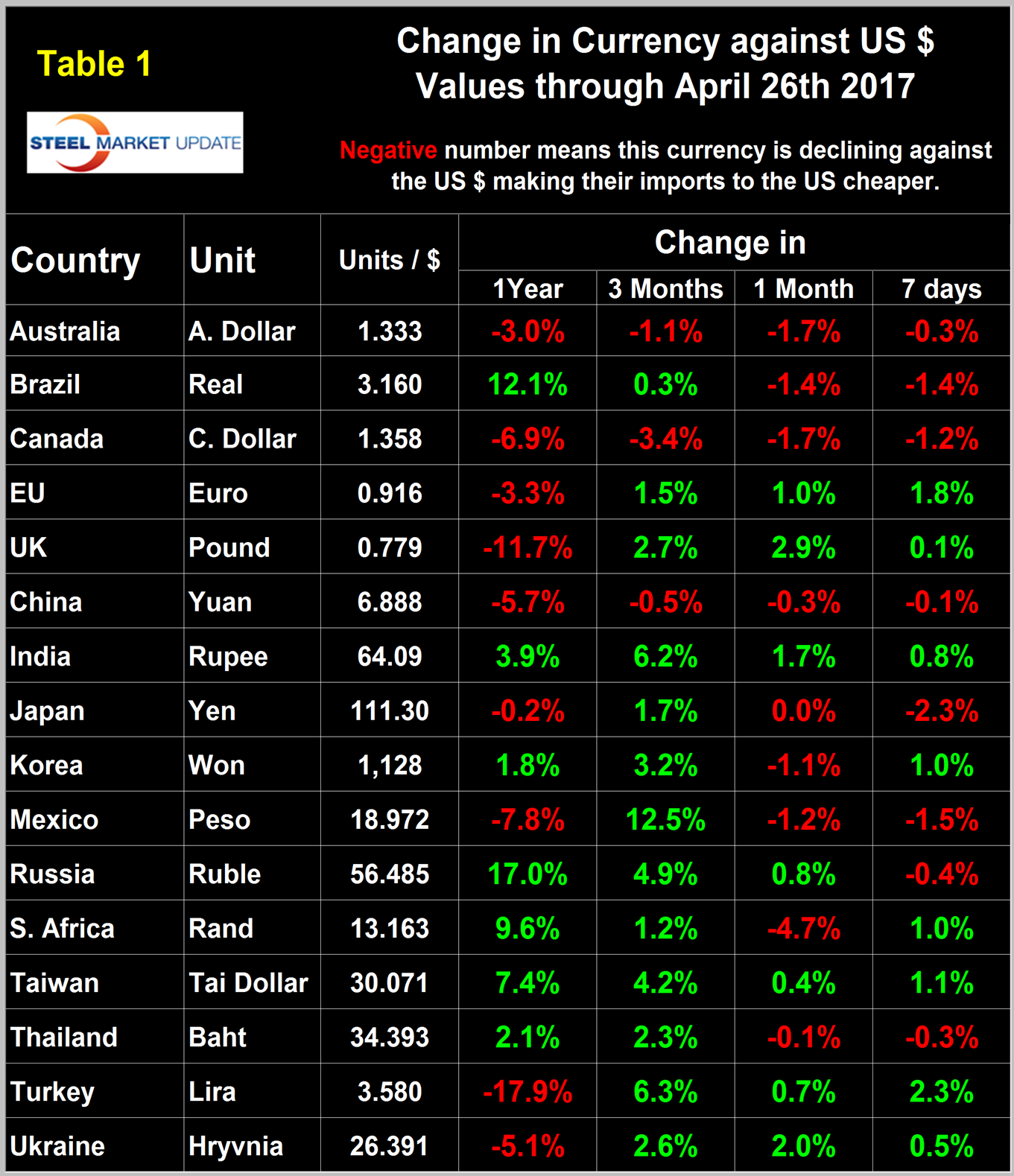 In each of these reports we comment on a few of the 16 steel trading currencies listed in Table 1. Charts for each of the 16 currencies are available through April 26th for any premium subscriber who requests them. We also include writings from experts who we regard as credible to explain some of the currency moves that we are living through.