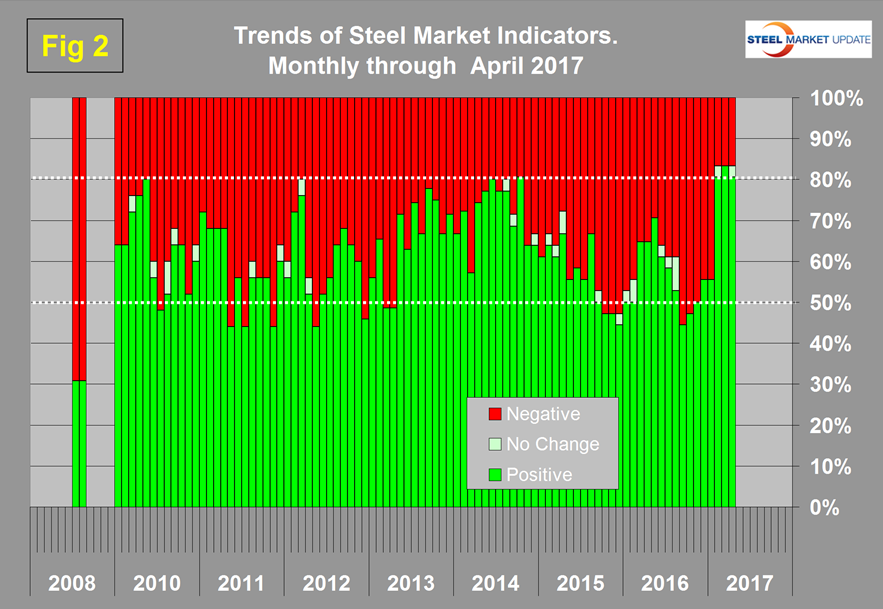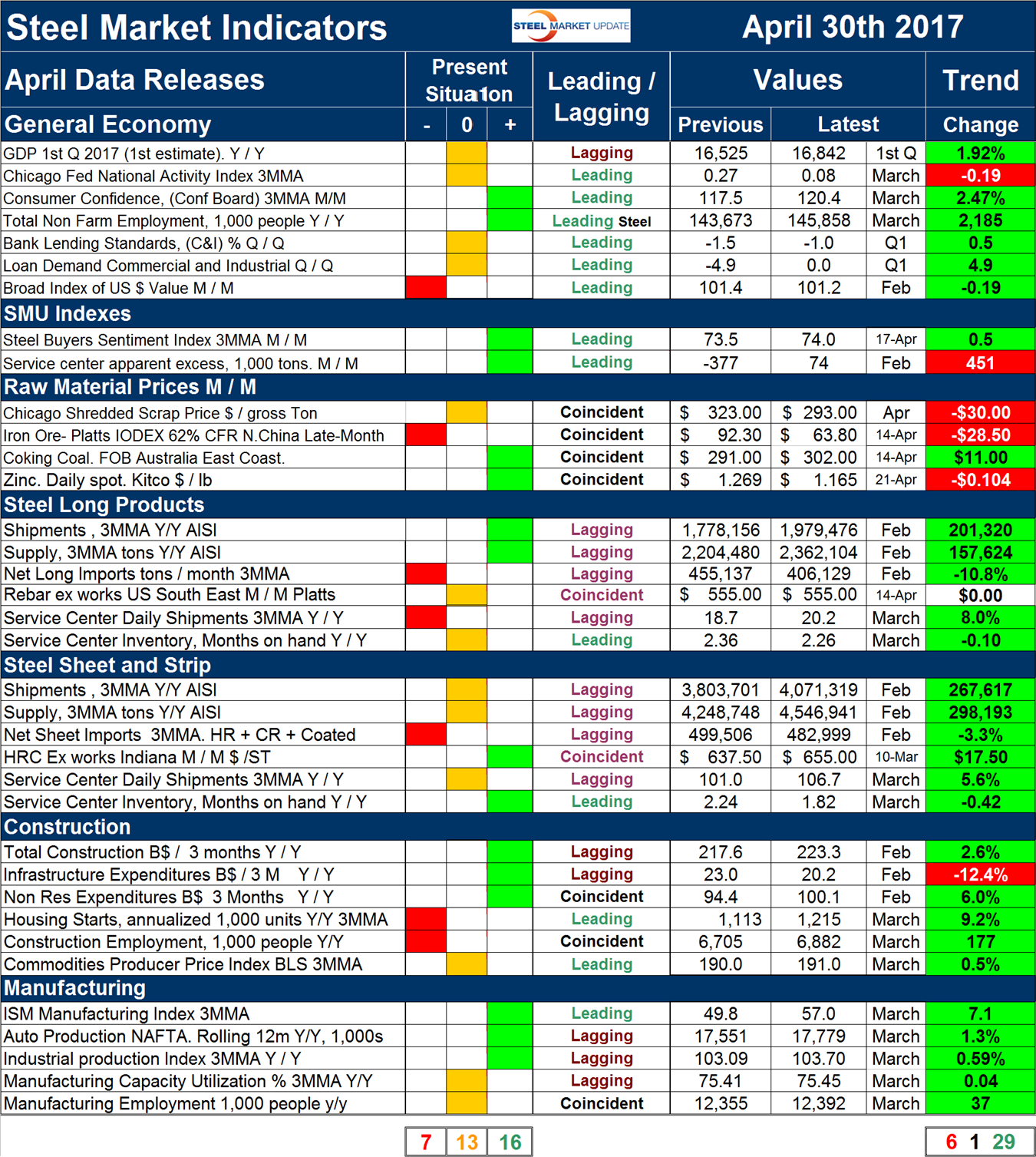 In the raw materials section three of the four materials that we track reversed direction. Scrap and iron ore both declined after rising in March, coke reversed course with an explosive price increase driven by supply side problems as cyclone Debbie barreled down the east coast of Australia. The price of zinc declined for the second successive month to $1.165/lb. on April 24th. We regard rising raw materials prices as positive and indicative of a strengthening market. In the sheet and strip section, all indicators trended positive and in long products all trended positive except the price of rebar which was unchanged. In the construction sector there were no trend changes with all except infrastructure expenditures trending positive. In manufacturing all indicators trended positive which was an improvement from our March report when capacity utilization trended negative.