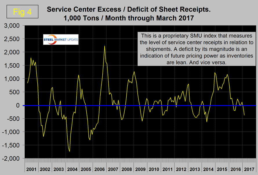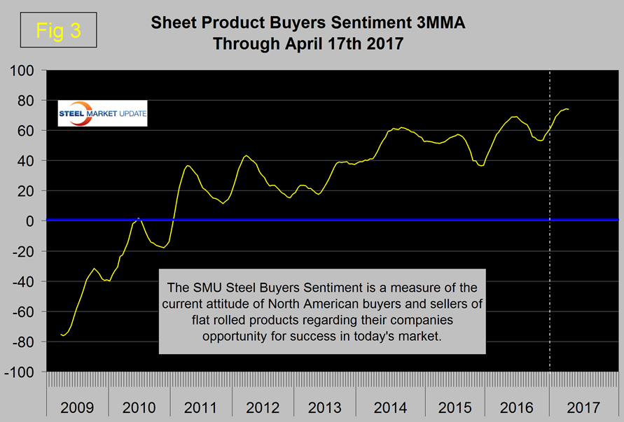 In the general economy, the Chicago Fed. National Activity Index reversed course and trended negative though it was still above the 50 threshold which suggests that economic growth is better than the historical norm. In March this indicator had its best value since December 2014. The CFNAI is a weighted average of 85 existing monthly indicators of national economic activity. In the SMU index section, steel buyers sentiment declined very slightly from its all time high in Mid march of 74.17 to 70.0 in Mid April (Figure 3) and service center excess of sheet products became positive in March after being in deficit in January and February.