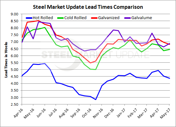 Hot rolled lead times are averaging close to 4.5 weeks (4.37) slightly less than the almost 5 weeks reported in mid-March and early April of this year and significantly shorter than the 5.39 weeks registered at this point last year.