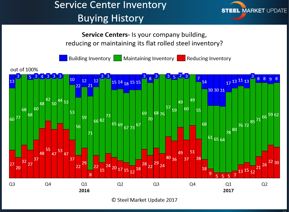 What we see in the graphic below is service centers built back inventories in late fourth quarter 2016 and early first quarter 2017. Since then the move appears to be more focused on balancing or removing excess inventories.