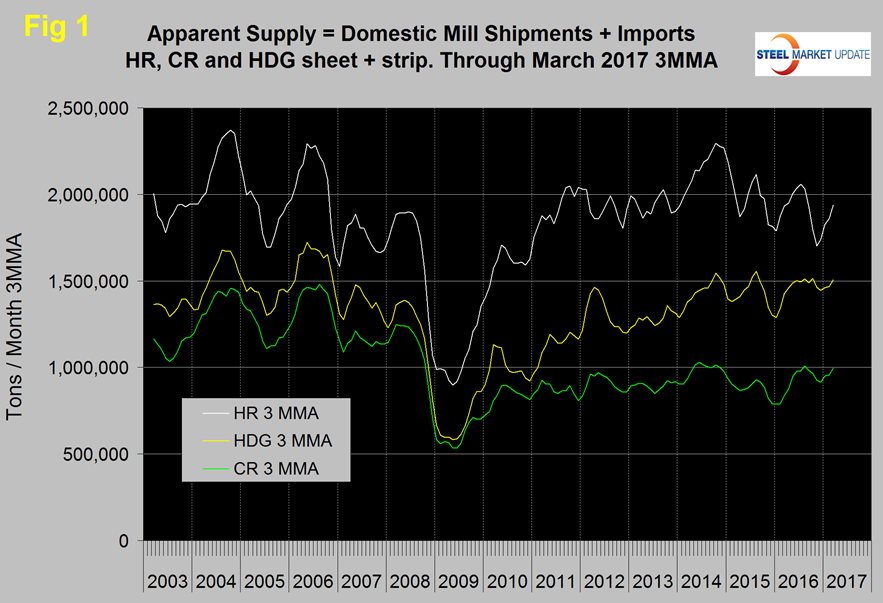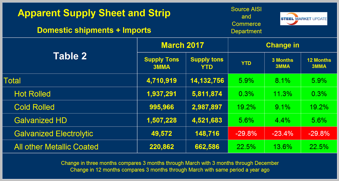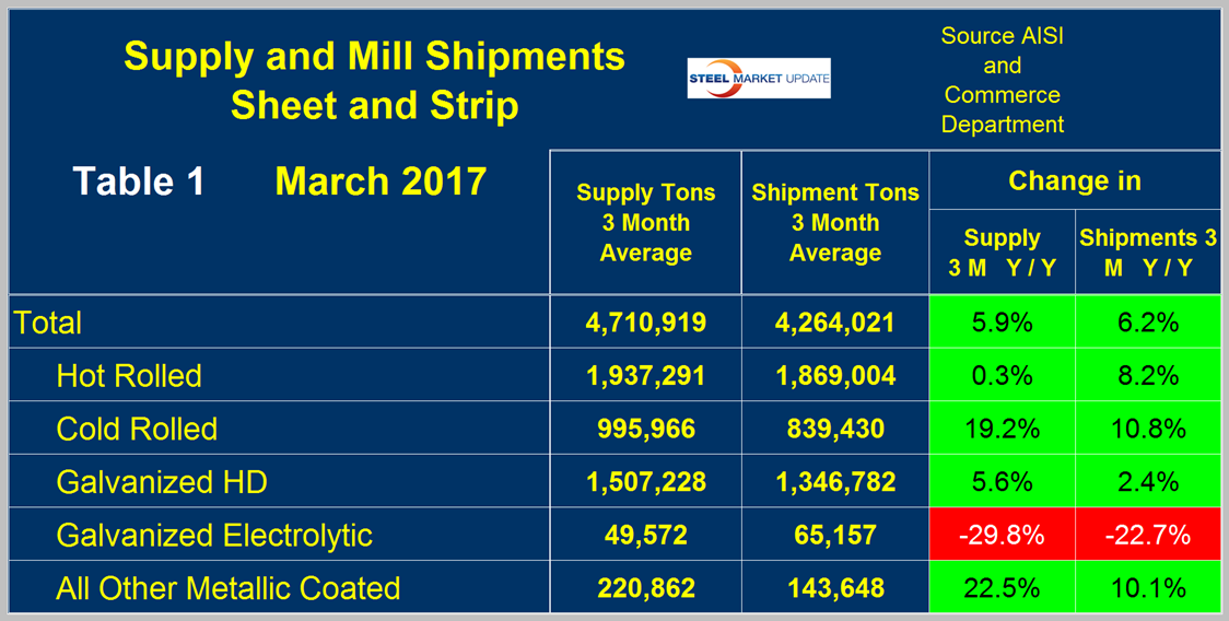 Table 1 describes both apparent supply and mill shipments of sheet products (shipments includes exports) side by side as a three month average through March, for both 2016 and 2017.
