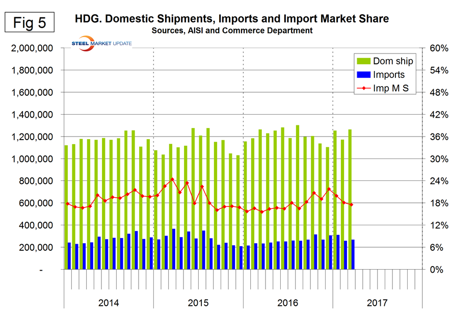 Based on a 3MMA, the import market share of sheet products declined from 21.7 percent in November to 18.6 percent in March which was the lowest share since June last year. Long product import market share is now below its trend since 2010 and in 3 months through March was 25.8 percent. Figures 3, 4 and 5 show mill shipments to domestic locations, imports and import market share for HRC, CRC and HDG. Import market share for the three products in March was 9.0 percent, 22.1 percent and 17.5 percent respectively.