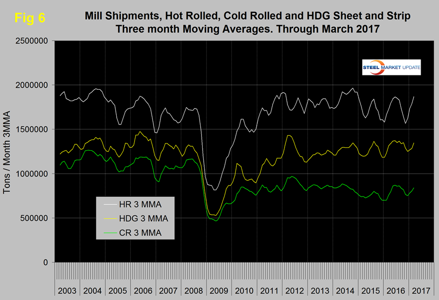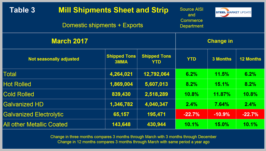 Table 3 shows that total shipments of sheet and strip products including hot rolled, cold rolled and all coated products were up by 6.2 percent in 3 months through March year over year and up by 11.5 percent comparing three months through March with three months through December.