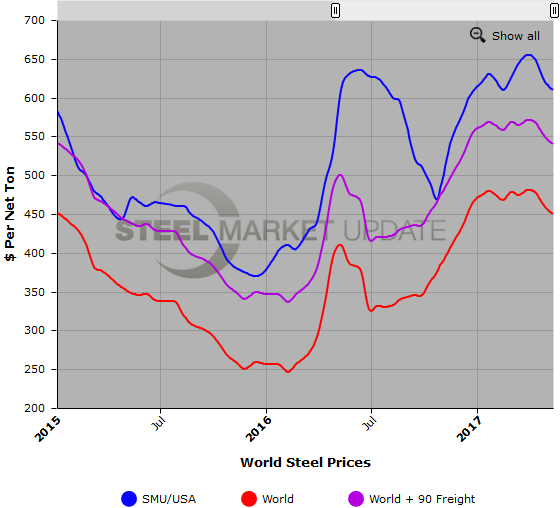 The SteelBenchmarker world export price for hot rolled bands is $450 per net ton ($496 per metric ton) FOB the port of export according to data released by SteelBenchmarker on Monday May 8th. This is down $13 per ton from the previous release on April 24th and down $28 from one month ago. Adding in $90 in estimated import costs, that puts prices around $540 per ton delivered to the US. As previously mentioned, the latest Steel Market Update hot rolled price average is $610 per ton.