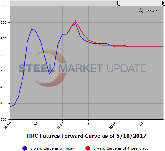 Below is a graph showing the history of the hot rolled futures forward curve. You will need to view the graph on our website to use its interactive features, you can do so by clicking here. If you need assistance with either logging in or navigating the website, please contact our office at 800-432-3475 or info@SteelMarketUpdate.com.