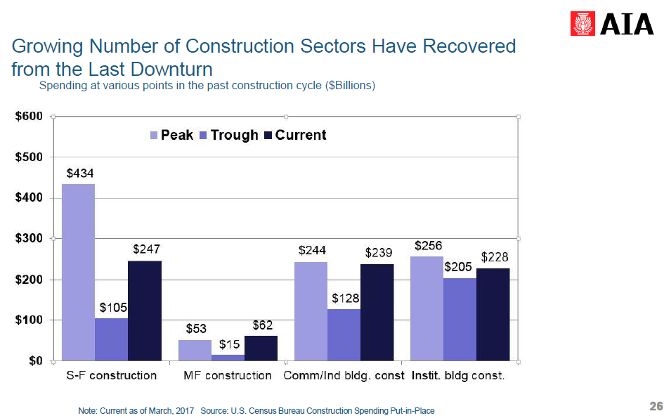 The chart below, from AIA and the US Census Bureau Construction Spending Put-in-Place, shows how construction sectors have fared since the downturn. Multifamily construction spending has exceeded its peak during the cycle but single family construction is well below. Commercial is nearing its peak but institutional spending has been slow to catch up. Total nonresidential construction spending in Q1 2017 is up 5 percent the same period in 2016.