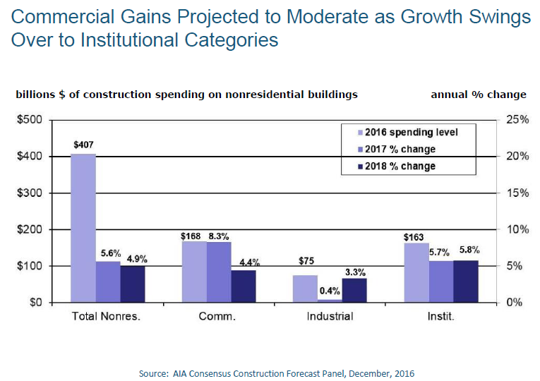 The Architecture Billings Index (ABI) began recovering in 2012, peaked in 2014 and began slowing in 2014-2016. AIA expects the volatile Index to be positive but slower in 2017 compared to last year.
