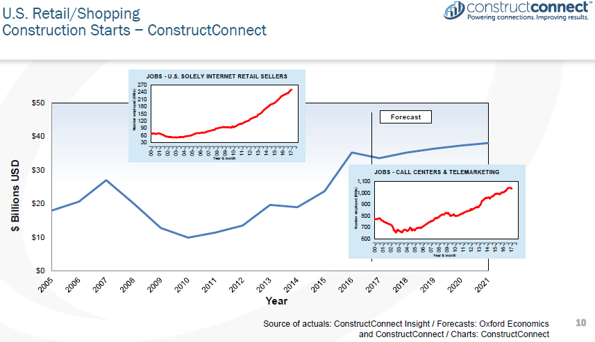 When looking at construction starts for the construction sectors it helps to also look growth for jobs in the sectors. Watching the trends in employment can improve forecasts for starts. For instance, retail/shopping construction starts are doing pretty well right now but if you look at the sharp increase in jobs for internet retail sellers and telemarketers it highlights concerns about whether brick and mortar stores will give way to online stores and distribution centers.