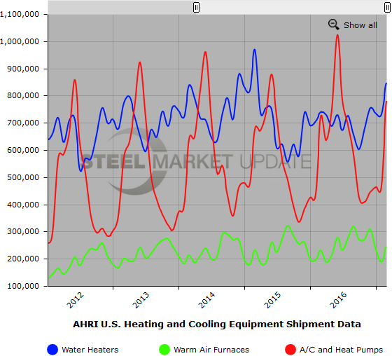 Below is a graph showing the history of water heater, warm air furnace, and air conditioner shipments. You will need to view the graph on our website to use it’s interactive features, you can do so by clicking here. If you need assistance with either logging in or navigating the website, please contact our office at 800-432-3475 or info@SteelMarketUpdate.com.
