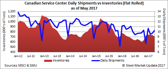 Canadian shipments of flat rolled products for the month of April were 194,300 tons, down 13.3 percent from March and down of 13.8 percent from the same month one year ago. Daily shipments increased from 9,700 tons per day in March to 10,200 tons per day this month, but were down compared to one year ago when they were 10,700 tons per day. Inventories at the end of the month were 708,400 tons, down 3.5 percent from last month but up 0.9 percent from the same month one year ago. The daily receipt rate for April was 8,858 tons per day, down from 9,322 tons per day in March. Total tonnage received was 168,300 tons, down from 214,400 tons the month before. Flat rolled inventories stood at 3.6 months in April, up from 3.3 months of supply in March.