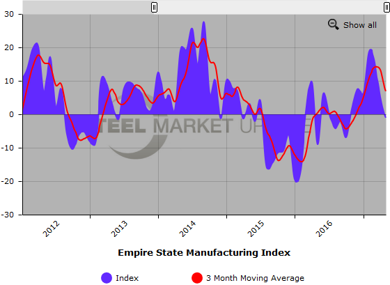 Below is a graph showing the history of the Empire State Manufacturing Index. You will need to view the graph on our website to use its interactive features, you can do so by clicking here. If you need assistance logging into or navigating the website, please contact our office at 800-432-3475 or info@SteelMarketUpdate.com.