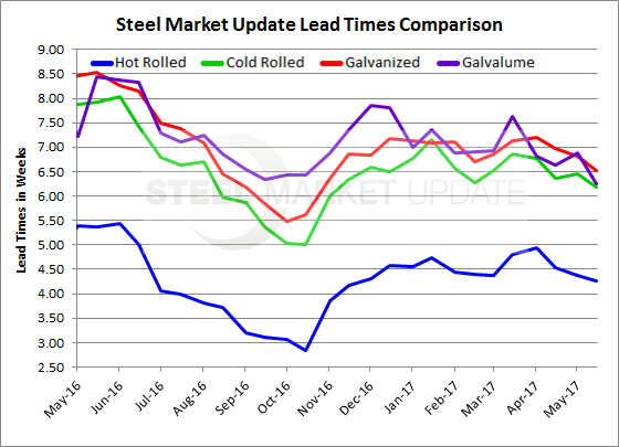 Galvanized lead times average 6.51 weeks, down from 6.82 weeks just two weeks earlier. One year ago, GI lead times averaged 8.53 weeks in mid-May 2016.