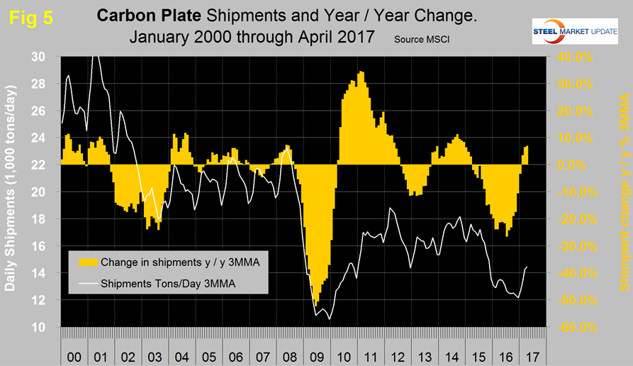 We then calculate the percent change between April 2017 and April 2016 and with the most recent 3 year April average. April this year was up by 6.0 percent from April 2016 and up by 3.2 percent from the three year April average. The fact that the y/y growth comparison is better than the three year comparison suggests that momentum is positive. Shipments of sheet and long products were up from April last year but plate and tubulars were down. Figure 2 shows the long-term trend of daily carbon steel shipments since 2000 as three month moving averages. (In our opinion the quickest way to size up the market is the brown bars in Figures 2, 3, 4 and 5 which show the percentage y/y change in shipments.)