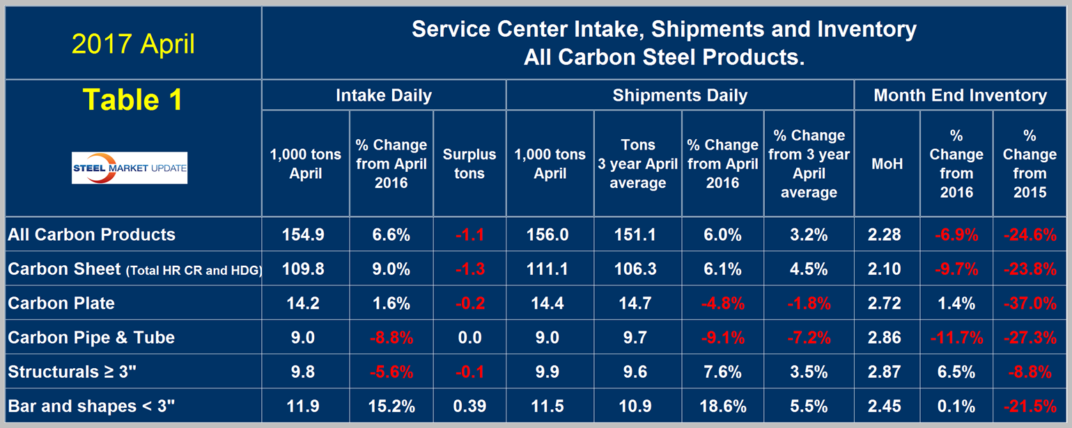 When we saw that shipments had dropped by over 500,000 tons in April our first thought was “Yikes!” but as we looked deeper we saw that shipping days in March were 23 days (their highest in the cycle) and in April fell to 19 days. Daily shipments in April increased by 6.6 percent from March. On average since 2009, April has contracted by 0.5 percent therefore these latest numbers are encouraging. Carbon steel shipments were 156,000 tons per day in April and months on hand on the 30th were 2.28, up from 1.94 at the end of March.