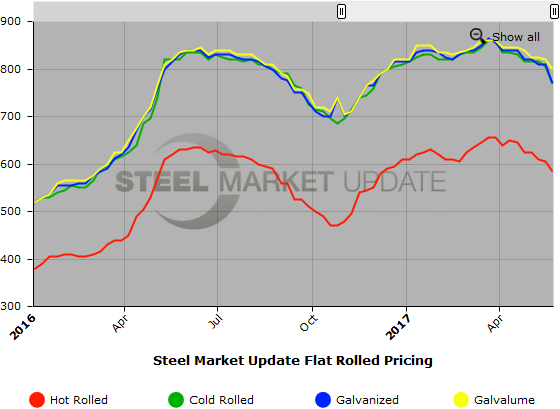 SMU Note: Below is a graphic showing our hot rolled, cold rolled, galvanized, and Galvalume price history. We will add plate prices to this graph once we have gathered a few months of data. To use the graphs interactive capabilities, you must view it on our website here. If you need help navigating the website or need to know your login information, contact us at info@SteelMarketUpdate.com or by calling 800-432-3475.