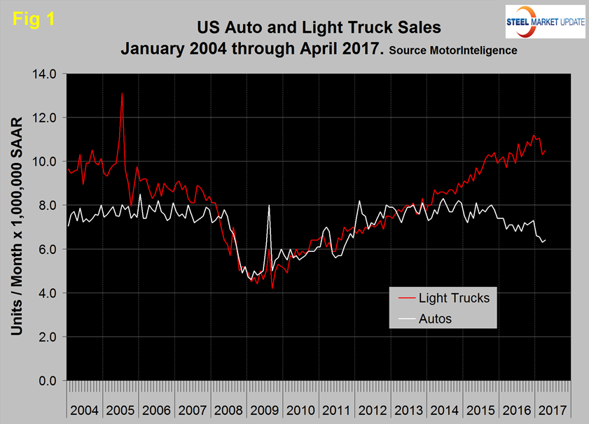 Vehicle sales averaged 17.2 million units, SAAR (seasonally adjusted annual rate) per month in the first four months of 2017, down from 18.1 million in Q4 2016. April sales improved slightly from 16.6 million in March to 16.9 million in April, but down 0.29 percent year on year. Light-truck sales improved from 10.3 million units in March to 10.5 million in April. Autos improved from 6.3 to 6.4 million.