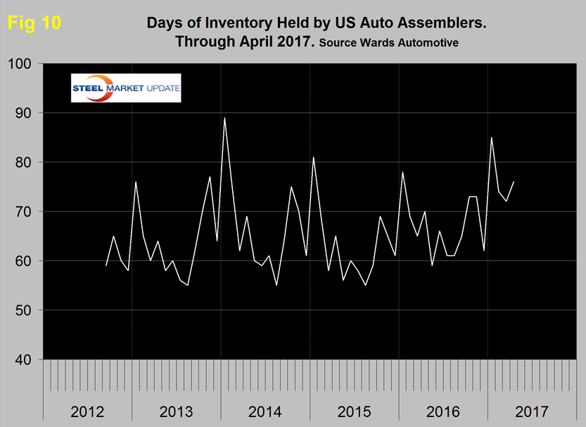 Ward’s Automotive reported this week that total light vehicle inventories in the US were 76 days at the end of April, which was up from 72 days at the end of March. Month over month FCA’s (Fiat Chrysler Automotive) inventory fell from 83 to 81 days, GM was up 1 to 99 days and Ford was down 2 to 81 days. Figure 10 shows that the overall level of inventories in the US has exhibited an increasing trend since August 2015.