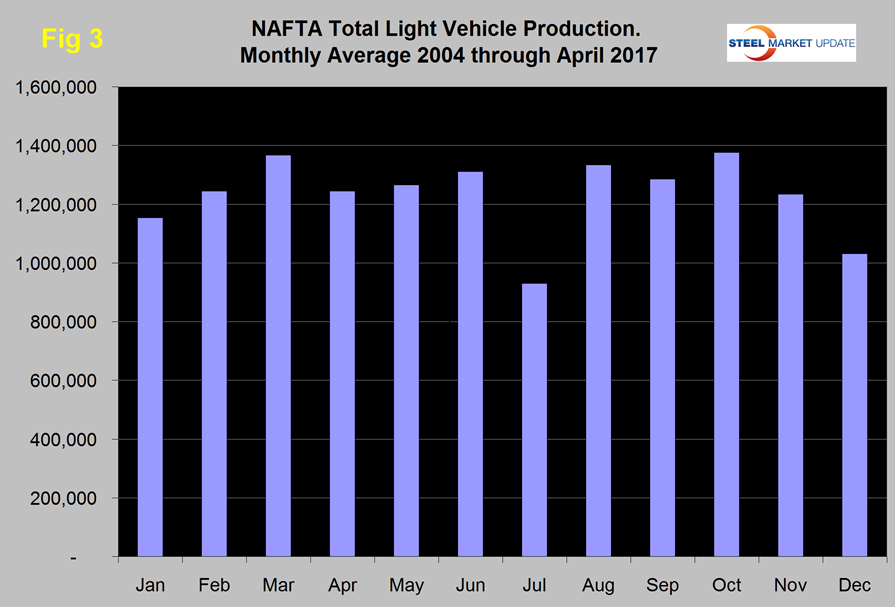 We can expect production to increase slightly through June then take a dive in July when manufacturers take their maintenance and re-tooling shutdowns. Note; production numbers are not seasonally adjusted; the sales data reported above are seasonally adjusted.