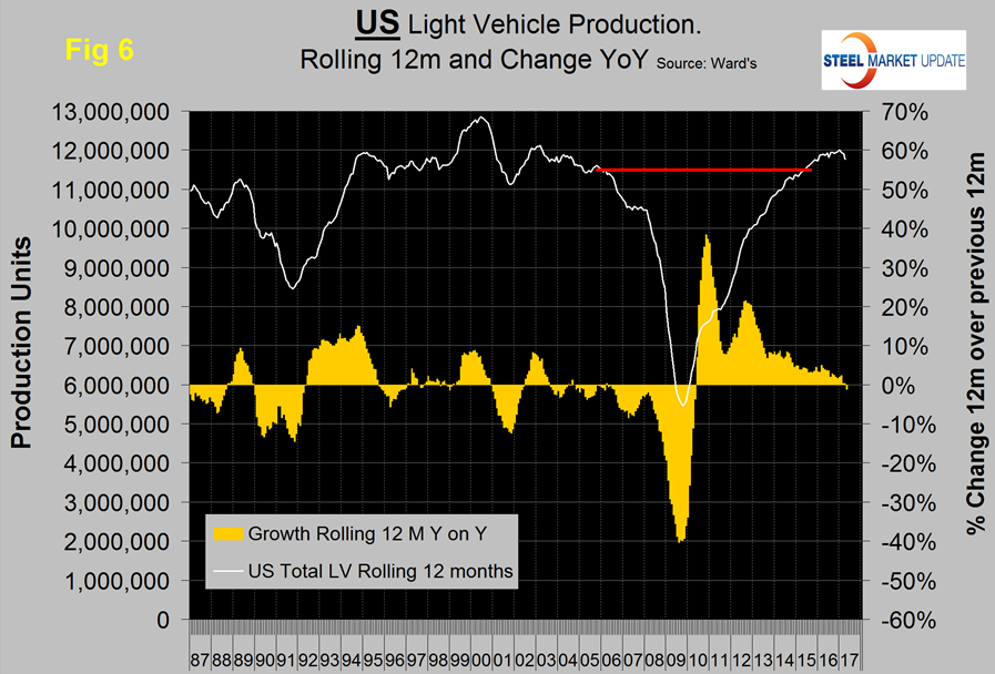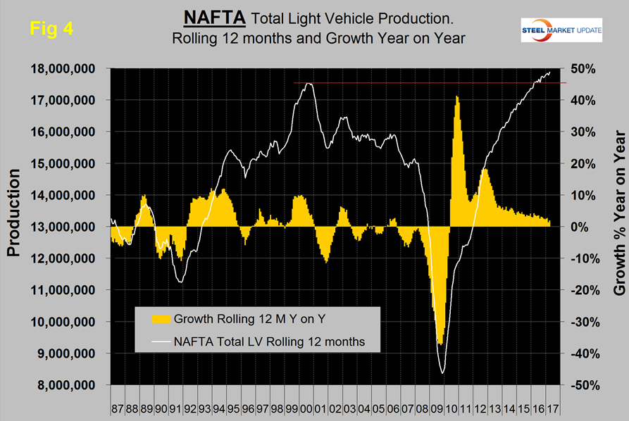 On a rolling 12 months basis y/y through April, LV production in NAFTA increased by 1.9 percent which was up from the 1.3 percent archived in12 months through March. There has been a very gradual slowdown in growth for the last three years as indicated by the brown bars in Figure 4; however production has been higher than the previous all-time high every month since early 2016.