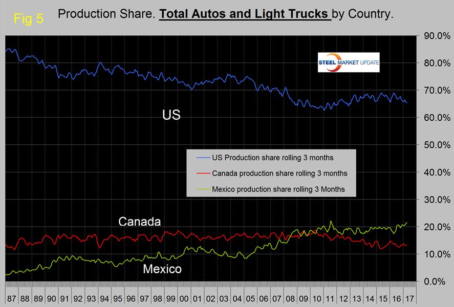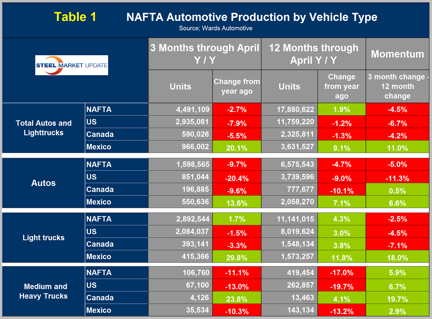 In April on a rolling three month basis, the US production share of total light vehicles was 65.4 percent, Canada’s was 13.1 percent and Mexico’s was 21.5 percent. The Mexican production target for 2020 is 5.0 million units according to Eduardo Solis, president of the Mexican Automotive Industry Association. This would be up from an average of 3.254 million in the 16 months since January 2016.
