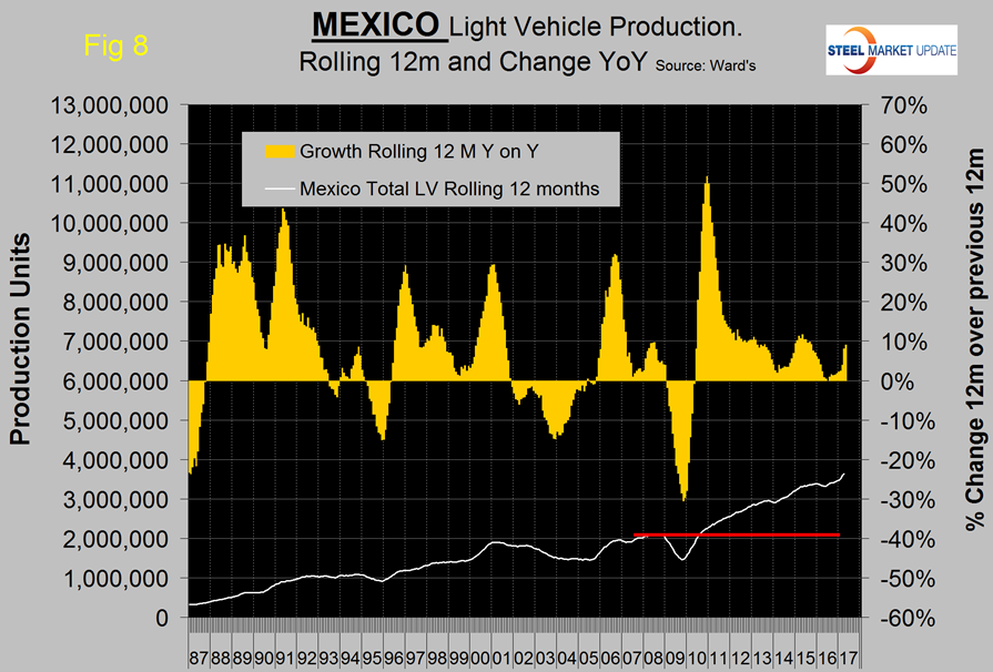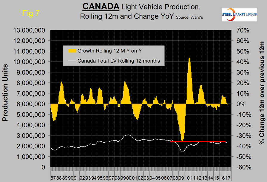 On a rolling 12 months basis y/y the US was down by 1.2 percent with negative momentum, Canada was down by 1.3 percent with negative momentum and Mexico was up by 9.1 percent with very positive momentum (Table 1).