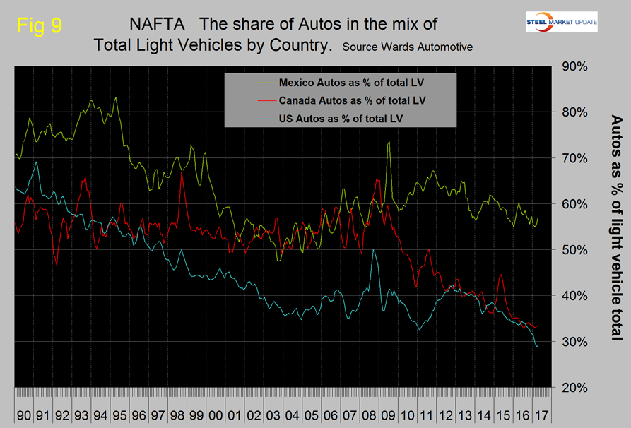 Figure 9 shows that the percentage of autos in the light vehicle mix has been declining for all three countries since 2012, driven by consumer buying preferences which in turn are heavily influenced by gas prices.