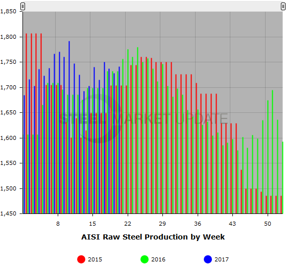 SMU Note: Below is a graphic showing the weekly raw steel production history. To use the graphs interactive capabilities, you must view it on our website. You can do this by clicking here. If you need help navigating the website or need to know your login information, contact us at info@SteelMarketUpdate.com or by calling 800-432-3475.