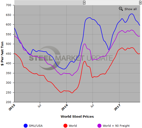 Below is a graph comparing SteelBenchmarker world HR export prices against the SMU domestic HR average price (we will build new data using Platts and replace the SteelBenchmarker data once we have collected a sizable history). We also have included a comparison with freight and traders’ costs added which gives you a better indication of the true price spread. You will need to view the graph on our website to use its interactive features, you can do so by clicking here. If you need assistance with either logging in or navigating the website, please contact us at 800-432-3475 or info@SteelMarketUpdate.com.
