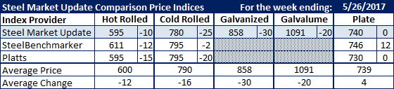 Flat rolled steel prices dropped last week as all three of the indexes followed by Steel Market Update (SMU) reported lower pricing.