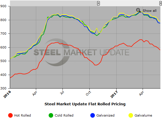 SMU Note: Below is a graphic showing our hot rolled, cold rolled, galvanized, and Galvalume price history. We will add plate prices to this graph once we have gathered a few months of data. To use the graphs interactive capabilities, you must view it on our website here. If you need help navigating the website or need to know your login information, contact us at info@SteelMarketUpdate.com or by calling 800-432-3475.