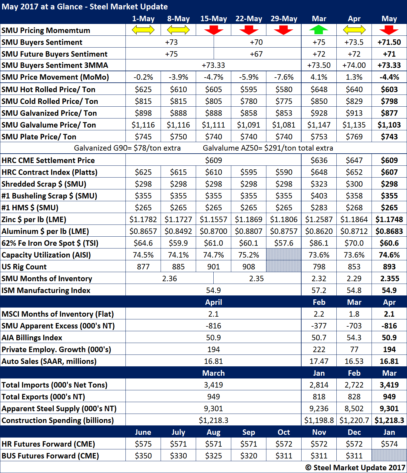 The month of May saw flat rolled steel prices and our SMU Price Momentum Indicator take a turn and move lower. Benchmark hot rolled pricing was $625 during the first week of May and ended the month at $580 per ton. The HRC average for the month was $603 per ton, $6 per ton lower than the CME Settlement Price and $4 per ton lower than the Platts average for the month.